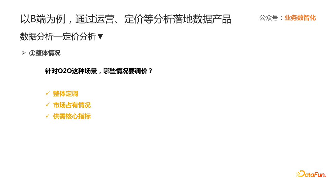 O2O 行业里面会涉及到一些定价的方法,如何更好的去做一些定价的调控,如何去评估业务的难点,还有一些日常规的业务问题。