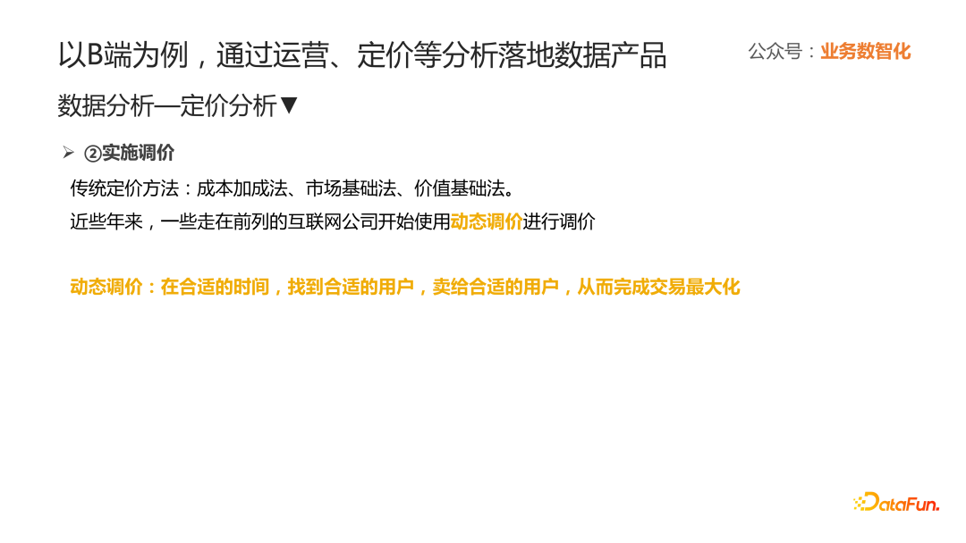 实施调价:动态定价是在合适的时间找到合适的用户,并且售卖。它是基于经济学原理中,人们对激励做出反应这样的基本策略来去进行调的。