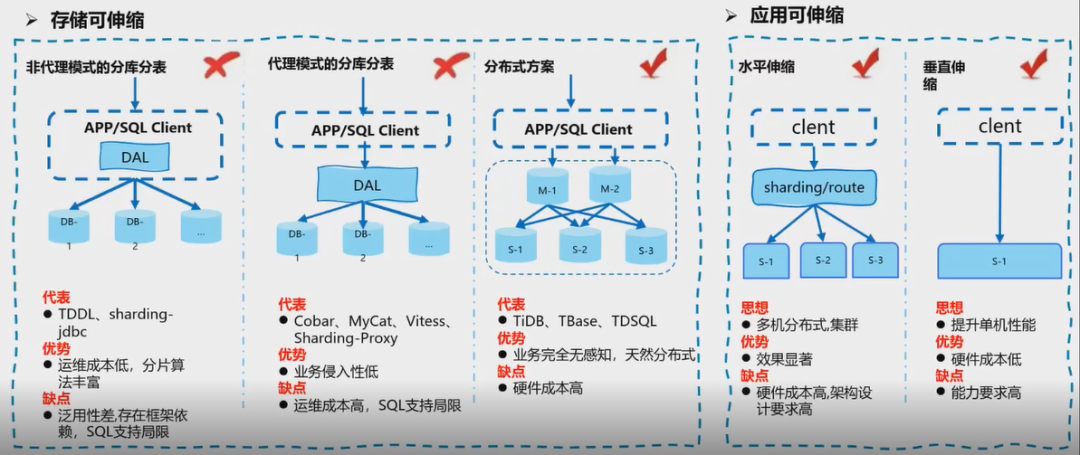 非代理模式的分库分表:应用和数据是放在同一个进程,它的优点是分片算法非常丰富,业务可以自定义分片逻辑;由于没有多余的服务进程,它的运维成本比较低,但是分片逻辑和业务耦合度高,导致泛用性较差。 代理模式的分库分表:DAL(数据接入层)作为单独的一个进程存在,对业务的侵入低,但是需要维护 DAL 服务,运维成本相对而言高一些。 分布式方案:对业务完全无感知,由 DB 层维护分布式事务和分片相应的逻辑,对硬件成本要求比较高。