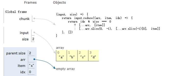 该函数使用 reduce 方法遍历 input 数组。对于索引为 idx 的每个元素 item,它检查 idx 是否是 size 的倍数。如果是,将创建一个新的子数组,其中只包含 item,并将其添加到结果数组 arr 中。如果不是,则删除 arr 中的最后一个子数组,将 item 添加到其中,并将修改后的子数组再次添加到 arr 中。