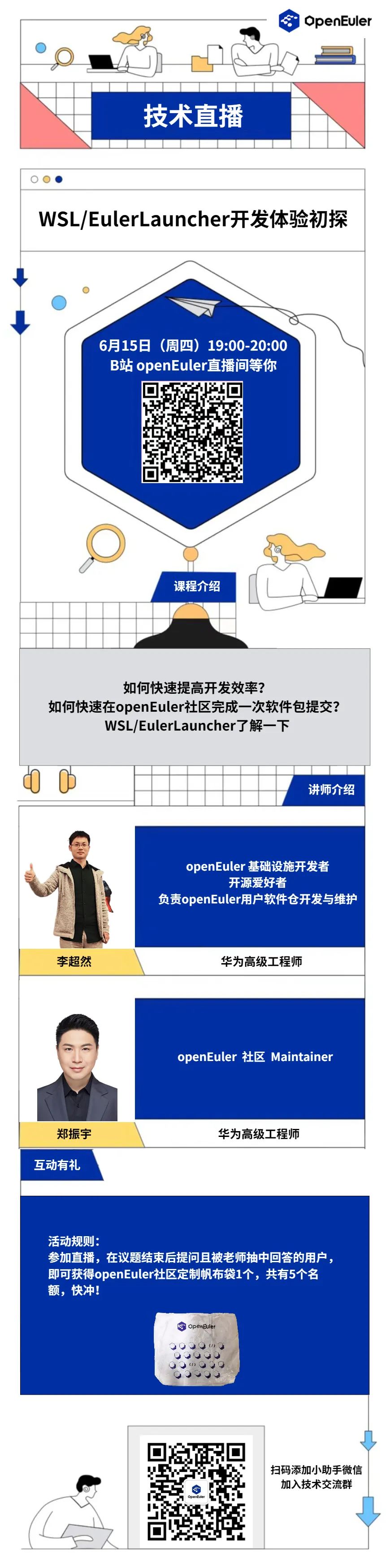 本次技术直播将详细介绍WSL/EulerLauncher的使用方法。不需要购买云资源、硬件设备,只要在自己PC上就能快速启用的openEuler开发环境。赶快预约直播,一探究竟吧!