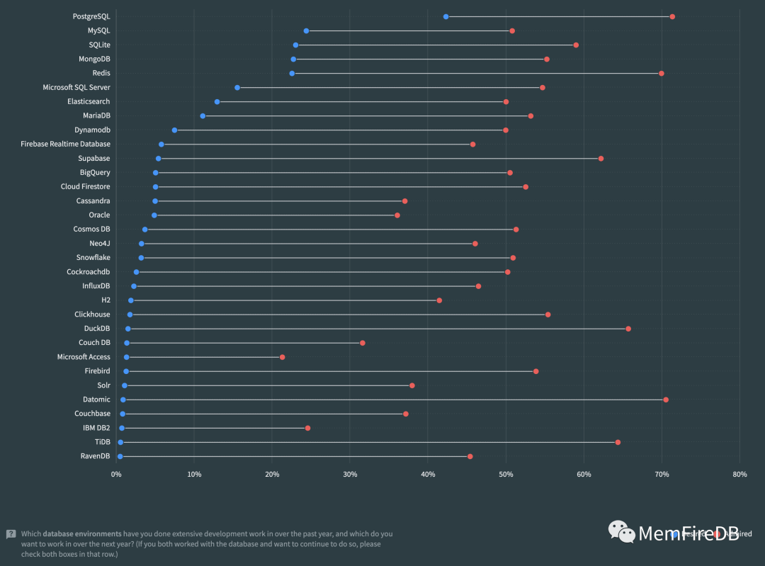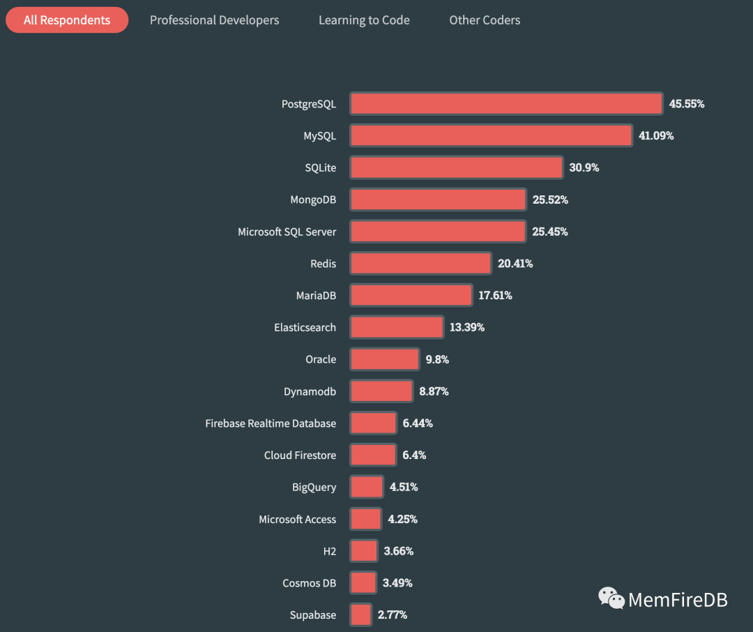 结果显示,专业开发者群体中更青睐于PostgreSQL,认可度更高。