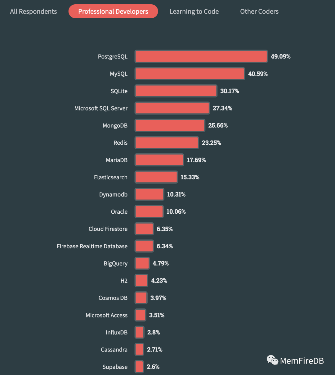 今年,在数据库领域的调查中PostgreSQL 取代了 MySQL 位居第一。在专业开发人员中,有49.09%的开发者正在使用PostgreSQL。