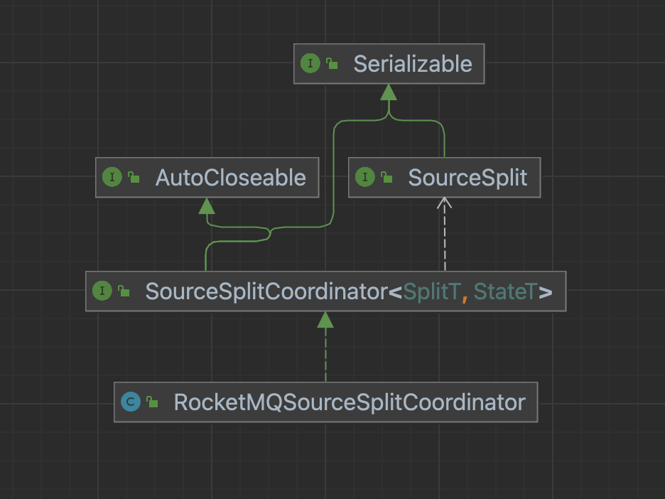public interface SourceSplitCoordinator<SplitT extends SourceSplit, StateT> extends Serializable, AutoCloseable {void start();void addReader(int subtaskId);void addSplitsBack(List<SplitT> splits, int subtaskId);void handleSplitRequest(int subtaskId, @Nullable String requesterHostname);default void handleSourceEvent(int subtaskId, SourceEvent sourceEvent) {}StateT snapshotState() throws Exception;default void notifyCheckpointComplete(long checkpointId) throws Exception {}void close();interface Context<SplitT extends SourceSplit, StateT> {boolean isRestored();*** Return the state to the split coordinator, for the exactly-once.*/StateT getRestoreState();*** Return total parallelism of the source reader.*/int totalParallelism();*** When Source reader started, it will be registered itself to coordinator.*/Set<Integer> registeredReaders();*** Assign splits to reader.*/void assignSplit(int subtaskId, List<SplitT> splits);*** Mainly use in boundedness situation, represents there will no more split will send to source reader.*/void signalNoMoreSplits(int subtask);*** If split coordinator have any event want to send source reader, use this method.* Like send Pause event to Source Reader in CDC2.0.*/void sendEventToSourceReader(int subtaskId, SourceEvent event);*** Schedule to run the callable and handler, often used in un-boundedness mode.*/<T> void runAsync(Callable<T> callable,BiConsumer<T, Throwable> handler,int initialDelay,long interval);*** Just run callable and handler once, often used in boundedness mode.*/<T> void runAsyncOnce(Callable<T> callable,BiConsumer<T, Throwable> handler);}}