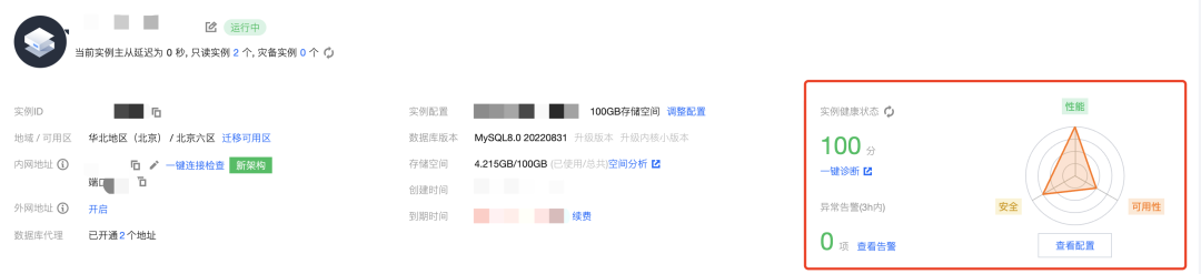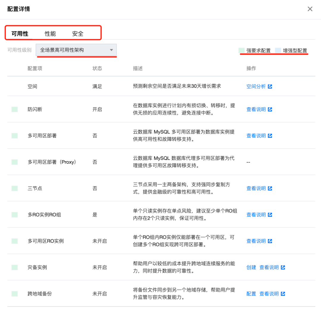 在新版控制台界面上,云数据库MySQL从可用性、性能、安全三个方面出发,提供给用户数据库功能配置详情。用户可根据业务情况,选择可用性级别,参考对应配置。此处,我们选择全场景高可用性架构配置,用户可参考各配置项状态栏查看当前实例是否已具备该能力。