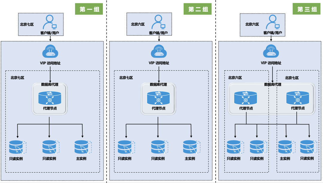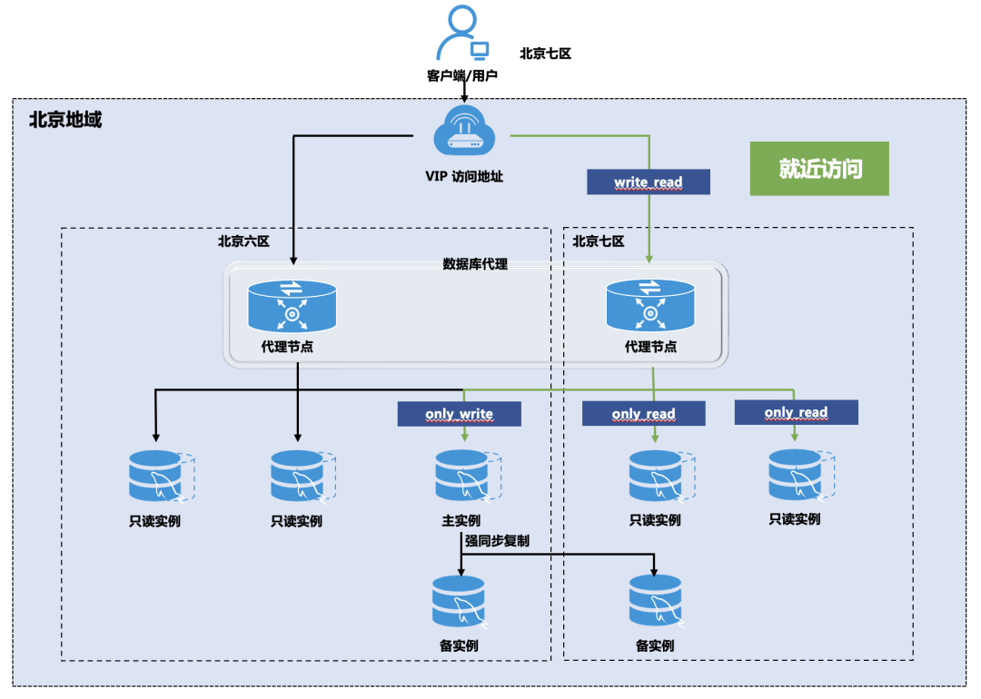 以图3为例,当客户端从北京七区发送读写访问请求时,系统会优先将读写请求送往北京七区的数据库代理节点,北京七区的数据库代理节点会进行读写分离操作,将读请求优先送往同可用区的只读实例,将写请求送往主实例。