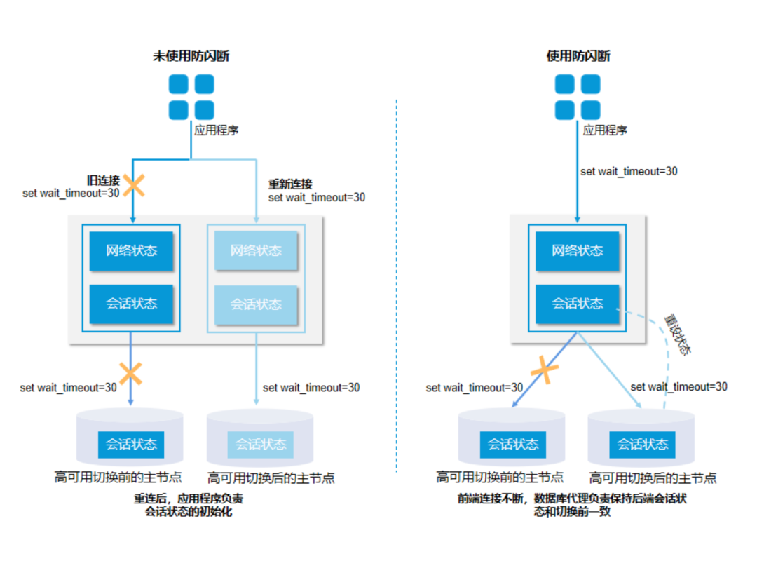在数据库运维中,会根据业务的需要经常对实例进行调整,例如配置变更、计划内HA切换、计划内重启等,此类操作往往会中断会话,导致连接闪断、新建连接失败等问题。proxy提供的防闪断能力就是用来解决此类场景下可能出现的连接问题。当proxy感知到计划内的有损行为时,就会与切换前的主节点断开连接,将客户端到proxy上的连接恢复至切换后主节点的连接上,通过 session track 能力将会话相关的系统变量、用户变量、字符集编码信息转移至新的后端连接上,实现对应用程序端无损切换。