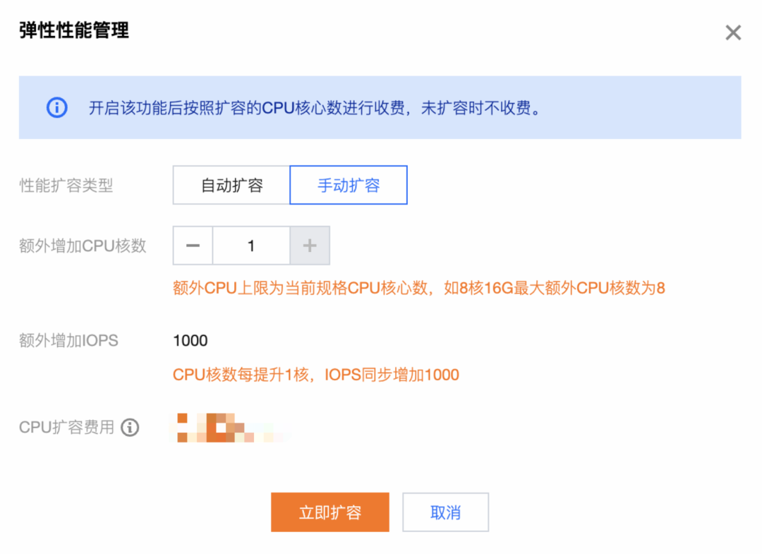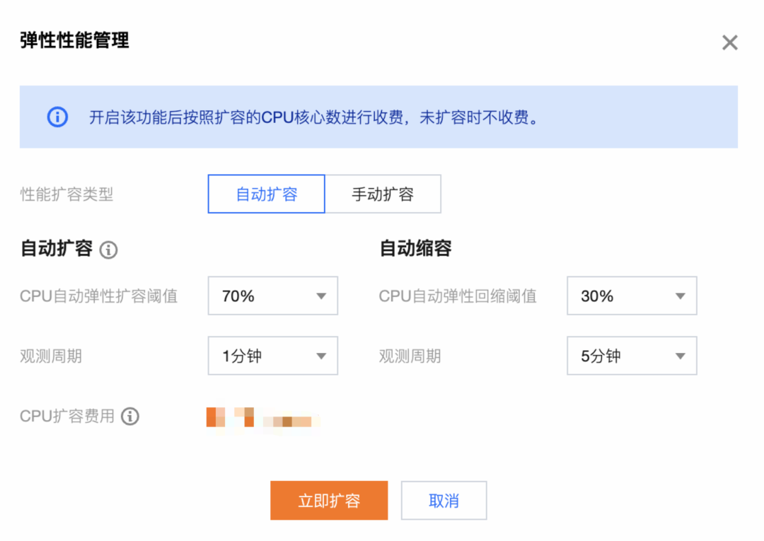 CPU弹性扩容是云数据库MySQL最新推出的能力项,指的是基于云环境通过动态分配CPU资源,可实现CPU资源的手动/自动调整和弹性扩展,主打一个快速响应和变更。当数据库访问量增加或CPU资源占用率上升时,可以自动添加更多的CPU资源,并在高峰期结束后自动缩减。这种弹性扩容的方式,能够使用户根据业务的需求和业务量动态地配置数据库的CPU资源,从而确保更好的数据库性能、可用性和稳定性,提高平台的弹性和可靠性。