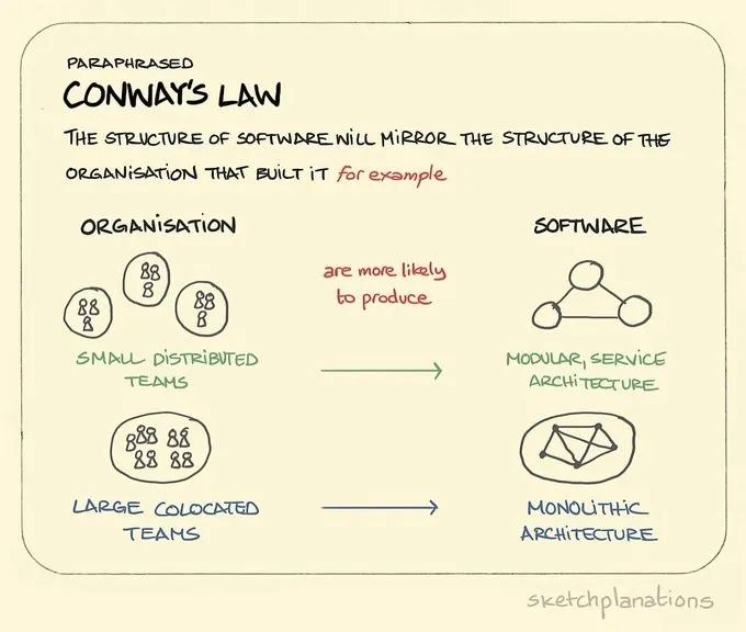 康威定律 ( Conway's Law) 由马尔文·康威于1967年提出:"设计系统的架构受制于产生这些设计的组织的沟通结构。"。即系统设计本质上反映了企业的组织结构,系统各个模块间的关系也反映了企业各个部门之间的信息流动和合作方式,内容示意如下图(图1):