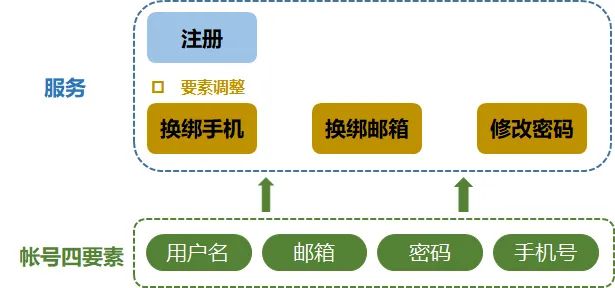 服务并非拆分得越细越好,过于细致的拆分会导致服务数量过多,反而增加了系统的复杂度和维护成本。为了避免过度拆分,我们可以对流程中依赖的业务要素进行分析,并适当进行流程间的聚合。以注册为例,流程最简化的情况下,只需围绕帐号四要素(用户名、密码、邮箱、手机号)完成即可。而对于换绑手机号流程,它依赖于密码或原手机号的验证(四要素中的其中两项)。因此,我们可以将注册和手机号换绑这两个流程合并到同一个服务中,以降低维护成本。