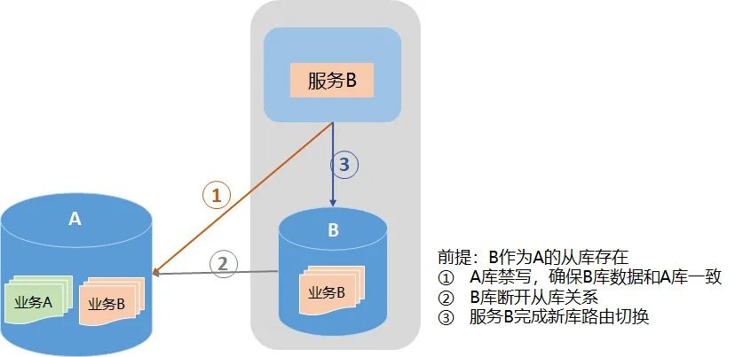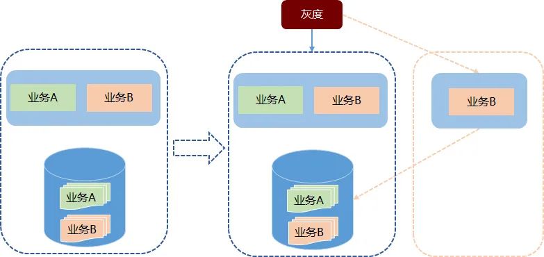 在对成熟业务进行服务拆分时,稳定性是关键。必须确保对业务没有任何影响,并且用户无感知。为了降低拆分实施的难度,我们会采取先拆服务(图6),再拆数据的方案。在服务拆分时,为了进一步降低风险,可以考虑下面两点做法:
