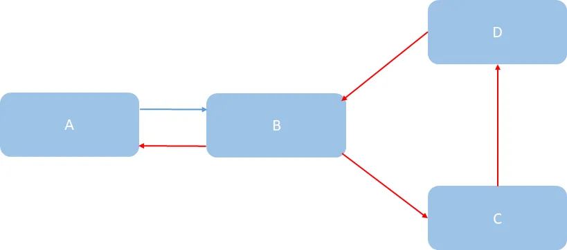 ADP(Acyclic Dependencies Principle)无依赖环原则,下图(图7)中红色线标识出来的依赖关系都是违背了ADP原则的存在。这种关系会影响“部署独立”的目标达成。试想下A、B服务互相依赖的场景,一次需求需同时对A、B相互依赖的接口改造,发版顺序应该是被依赖的先部署,相互依赖就进入了死循环。