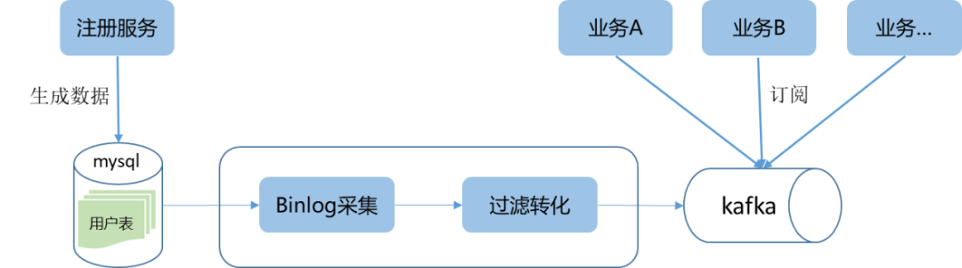 需要提醒的是使用消息组件会增加系统的复杂性,异步天生要比同步更复杂,需要额外考虑消息乱序、延迟、丢失等问题。针对这些问题可以尝试下面方案:不在服务流程中直接发送消息,而是依赖服务流程产生的数据,进行消息生产,如下图(图10)。帐号系统中使用场景有帐号注册、注销后的业务通知。