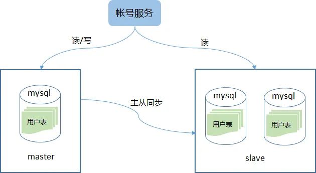 帐号业务特点是读多写少,所以最早遇到的压力是数据库读的压力,而读写分离架构(图13)可以有效降低主库的负载。读写分离方案中由主库承担全部写流量,从库和主库共同承担读流量。从库同时可以配置多个,通过多个从库来分担高并发的查询流量