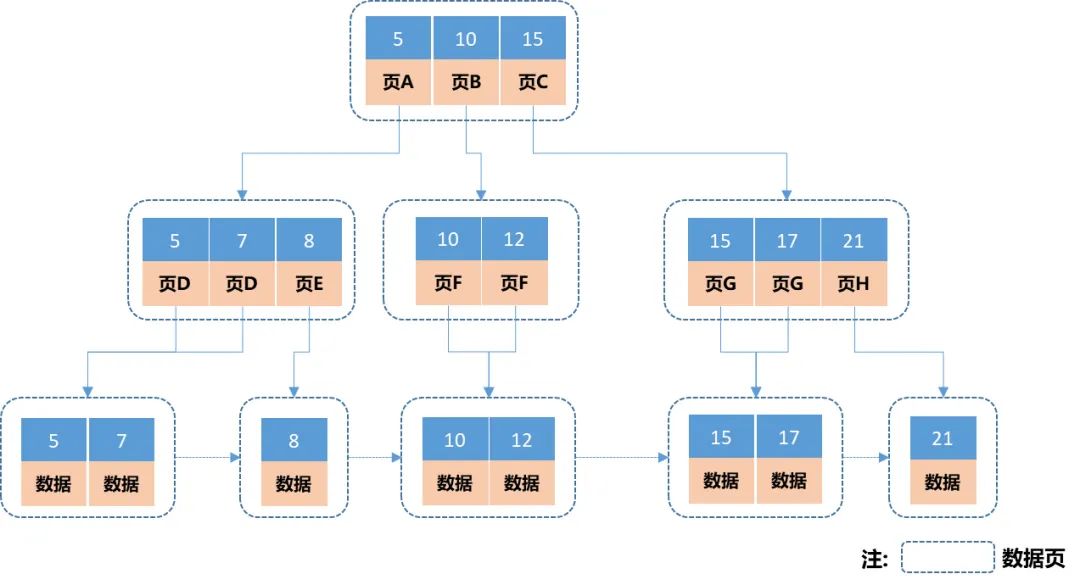 大表最直接给人的感受是会影响查询效率,我们以 mysql-InnoDB为例分析下具体影响。InnoDB存储引擎是以B+Tree结构组织索引,以主键索引(聚簇索引)为例,它的特性是叶子节点存放完整数据,非叶子节点存放键值+页地址指针。这边的节点,对应到存储就是数据页的概念。数据页是InnoDB最小存储单元,默认大小为16k。一个聚簇索引的示意图(图14)如下: