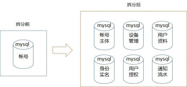 拆分后的帐号主体库,是最核心业务库。库里围绕帐号四要素(用户名、密码、邮箱、手机号)组织数据,这样帐号的核心流程登录、注册的数据依赖就不再受其他数据的干扰。这种拆分方式属于垂直拆分,将表根据一定的规则划入不同的库。