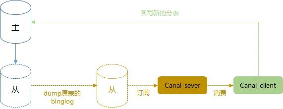 除了上面垂直分库的场景外,帐号还经历过单个核心业务表数据量过亿后的水平拆分,这个场景复制迁移的方案就不适用。拆分是在18年底实施的,方案借助开源的Canal实现数据迁移。整体方案如下(图17)。