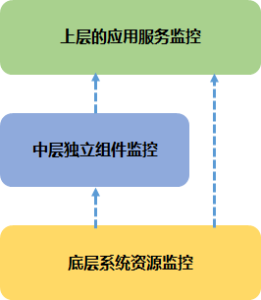 监控内容涵盖三层的原因,如果你只关注应用服务,如果问题发生,你只是知道了一个结果,无法进行快速定位分析,只能根据经验排查各项的可能性,这样的故障处理速度是没办法忍受的。而往往上层的应用的告警,可能就是一些组件或则底层系统资源的异常引起的。假设我们遇到服务响应时长告警时,如果这时候有对应JVM FGC 时长告警、或myql的慢查sql告警,这就很方便我们快速的明确优先排查的方向,确定后续的处理措施。