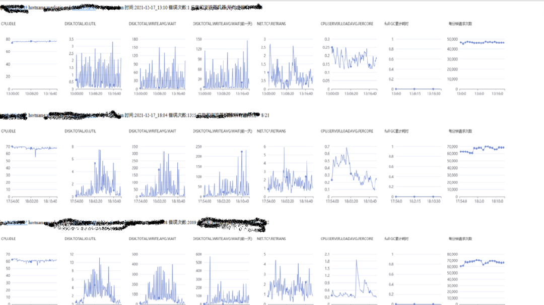 三个维度监控的内容,因为公司内分工的存在,研发、应用运维、系统运维,容易出现各管各的,监控指标也可能会分散在不同系统,这样是非常不利于问题定位分析。最好的监控系统是能将这三个维度的指标进行打通,这样问题分析处理会更加高效。下面是我们在跟踪“偶发性dubbo服务线程满”问题时的经历。偶发性问题排查的难点,不能拿一次的分析结果定论。借助公司业务监控系统的帮助,我们排除了redis等中间组件的影响后,我们就开始将关注点放在了主机指标上,为了方便问题定位,我们自己做了 虚拟机反推 宿主物理 再到宿主机上所有虚拟机的关键指标(CPU、IO、NET)聚合,效果如下(图19)。经过多次验证后确定了宿主机上个别应用磁盘IO异常过高导致。