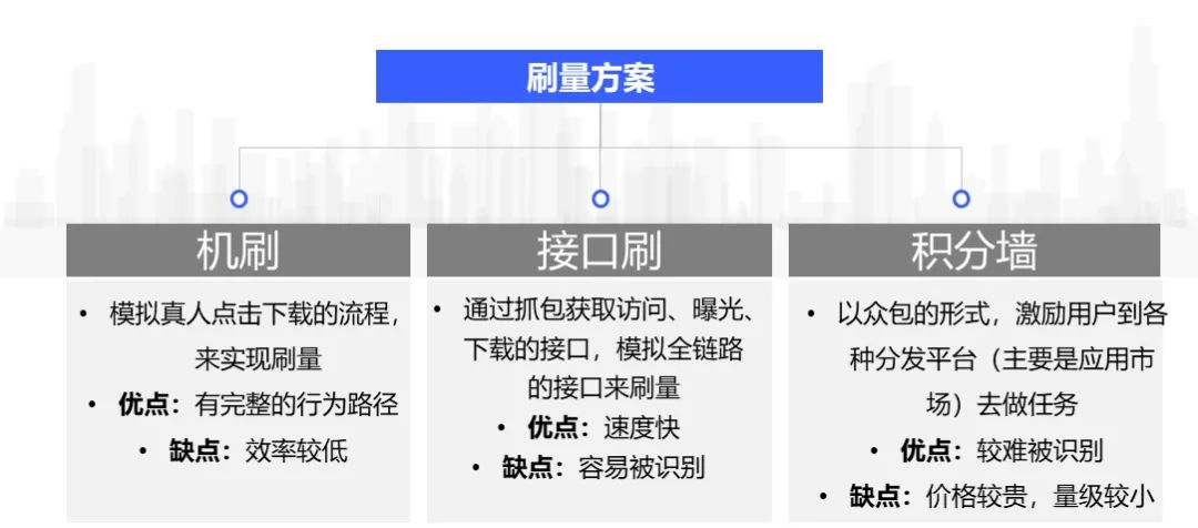 不同的刷量方式各有优缺点,黑产一般根据场景的刷量量级和作弊难度进行选择。
