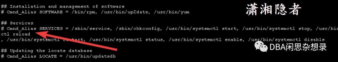 然后修改/etc/sudoers中的配置,取消## Services下的别名注释,设置Services别名,