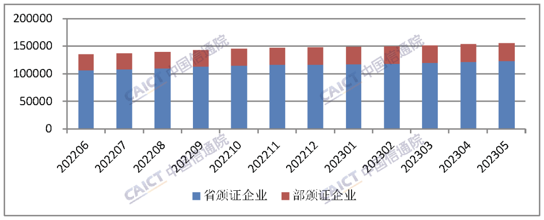 截至2023年5月底,全国增值电信业务经营许可企业共149089家(其中5804家企业同时持有工业和信息化部及省通信管理局颁发的增值电信业务经营许可),比上月增长1.15%,其中工业和信息化部许可的跨地区企业31624家,各省(区、市)通信管理局许可的本地企业合计123269家,分别比上月增长0.08%和1.31%。