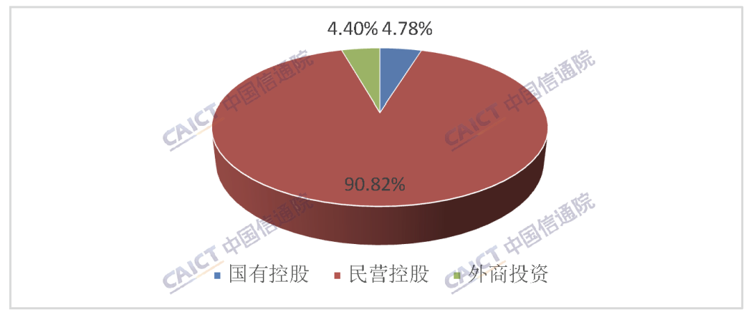 目前国内增值电信领域已经形成多元化的投融资市场,民营资本已经发展成为增值电信业务领域的主力军,外商投资企业比例持续快速提升。截至2023年5月底,部颁增值电信业务经营者中,国有控股企业1513家,占经营者总数的4.78%;民营控股企业28720家,占经营者总数的90.82%;外商投资企业1391家,占经营者总数的4.40%,详见图5。