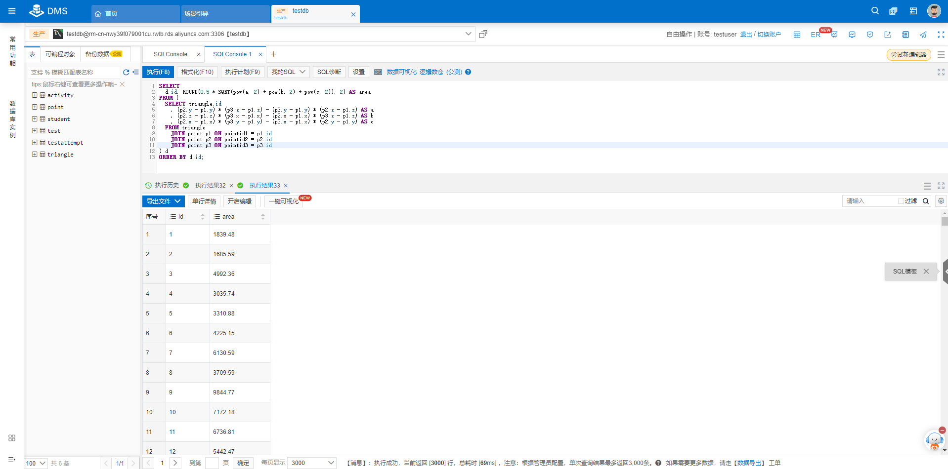 首先通过JOIN操作获取每个三角形三个顶点的坐标,然后利用向量积的长度公式计算面积,最后使用ROUND函数将结果保留到小数点后两位。