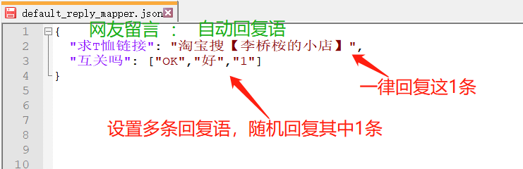 {"关键词":"回复语"}或者{"关键词":["OK"],["好的"],["1"]}(注意,单引号、冒号、逗号、中括号等都是英文输入法状态下的标点符号,双引号里面的内容可以任意设置)