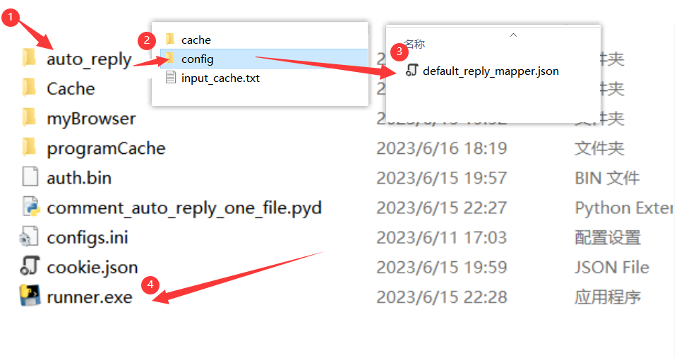 默认配置文件只有在打开本exe软件前设定好才有效,即,需要先打开auto_reply文件夹,找到cache文件夹下的default_reply_mapper.json文件,配置此json文件中的【关键词-回复语】,然后再打开runner.exe文件。打开后再修改不会立刻生效,除非重新打开,专业的术语叫冷重载。