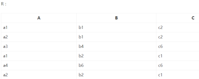 下面我们只用x的象集和S在Y关系上的投影({(b1,c2)(b2,c1)})进行对比就行了,发现只有a1和a2的象集包含这个投影,也就是R/S= {a1,a2}