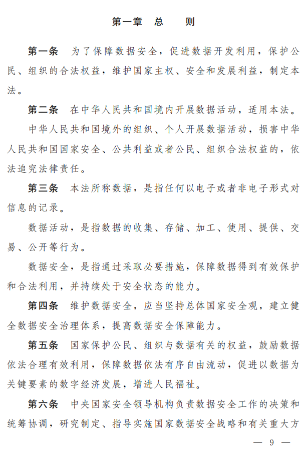 草案明确在我国境内开展的数据活动适用本法,其中数据是任何以电子或者非电子形式对信息的记录,数据活动是指数据的收集、存储、加工、使用、提供、交易、公开等行为。同时,草案赋予本法必要的域外适用效力,规定:中华人民共和国境外的组织、个人开展数据活动,损害中华人民共和国国家安全、公共利益或者公民、组织合法权益的,依法追究法律责任。(草案第二条、第三条)