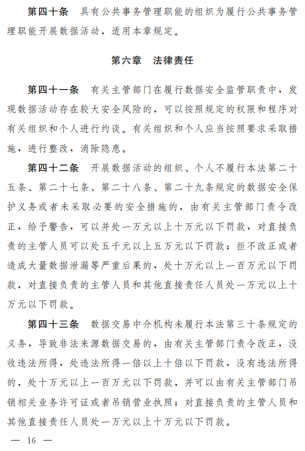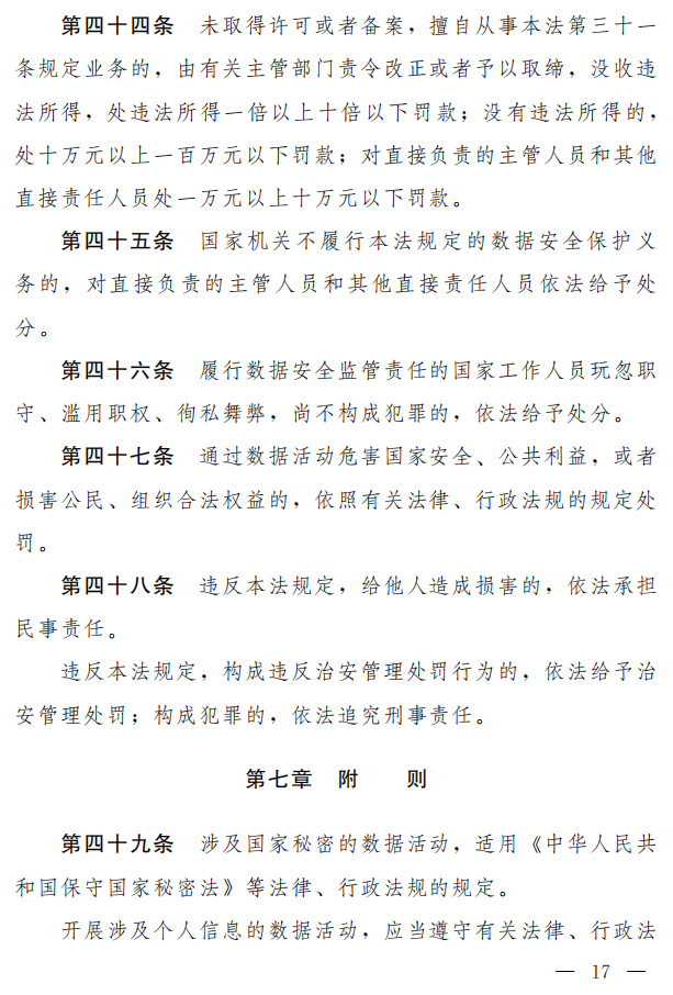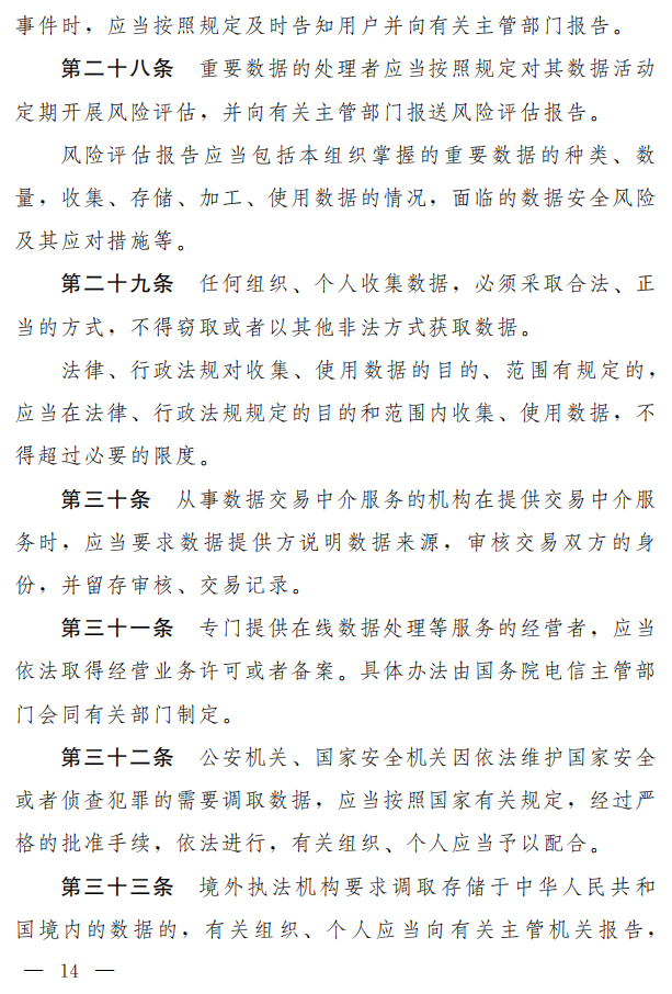 五是,对公安机关和国家安全机关因依法履行职责需要调取数据以及境外执法机构调取境内数据时,有关组织和个人的相关义务作了规定(草案第三十二条、第三十三条)。
