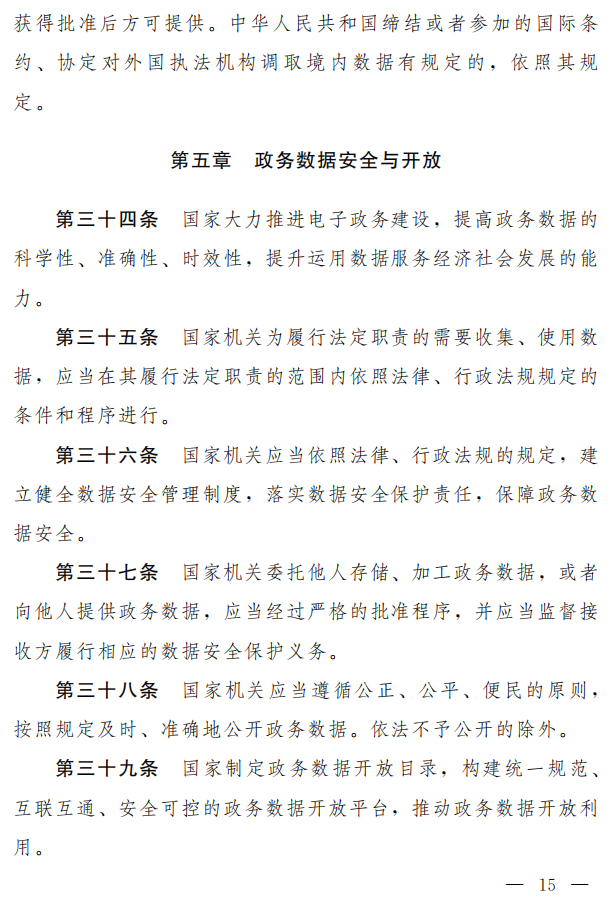 二是,规定国家机关收集、使用数据应当在其履行法定职责的范围内依照法律、行政法规规定的条件和程序进行,并落实数据安全保护责任,保障政务数据安全(草案第三十五条、第三十六条)。