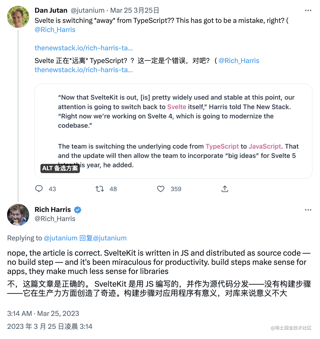 这种震惊劲爆的信息,当然的核实下是不是准确的,于是去 svelte 框架的作者 Rich Harris 的推特去求证下,好奇的不止我一个,已经有人提问了,并且作者给出了答案,非常确定:
