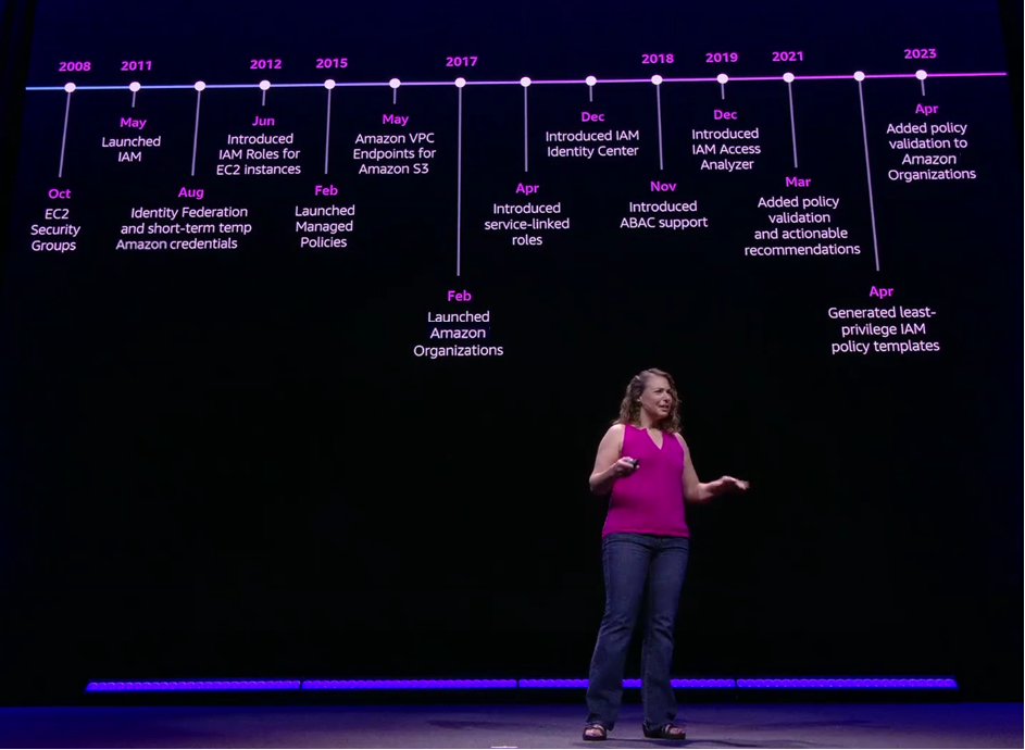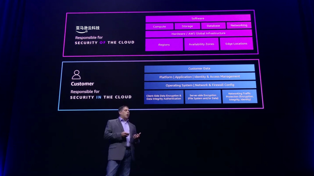在“云中客户负责”部分,亚马逊云科技高级首席工程师 Becky Weiss 介绍了云中安全问题。承接 CJ Moses 的话题,她还就亚马逊云科技在安全合规领域的重要里程碑进行了梳理和回顾。