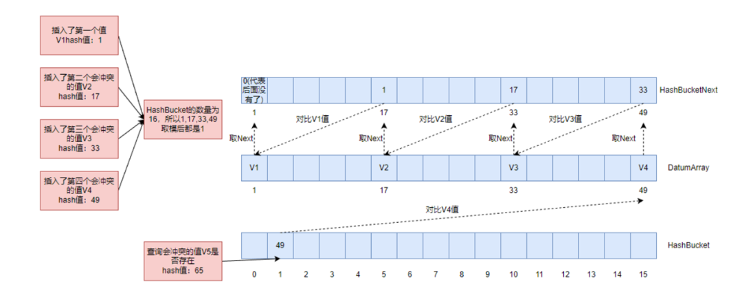 不难看出,表示位置的整型数据,高bit实际上大部分都是不使用的,一个int32bit,表示几百万数据可能只用了20多个bit而已,我们可以利用高bit的数据作为hint,来对冲突进行指示。
