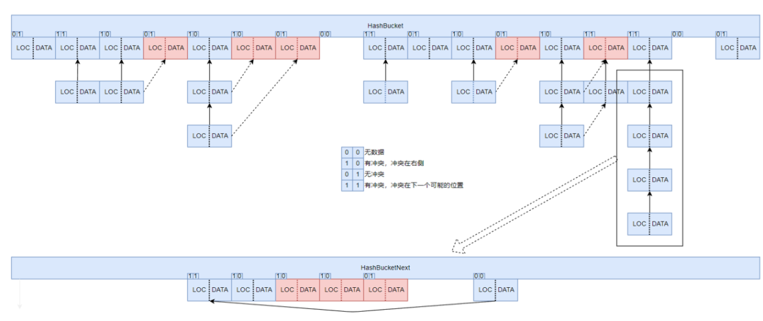 这里实际上是只用了2bit,4种组合来指示冲突的位置,这个做法实际上对解决冲突的内存访问性能得到了的提升。因为基于原来的实现,必须要访问next数组,检查值是否为0,才能判断出后面是否还有冲突,现在只要访问当前元素的位置信息的高bit,就可以检查出这个元素后面是否还有冲突,避免了无效的内存访问。