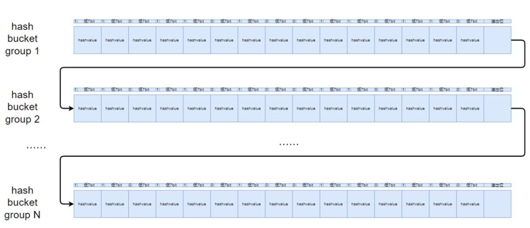 优化方向3:改用线性探测的方式,但一个hashbucket不只存储一个元素,而是一组元素,并添加位图