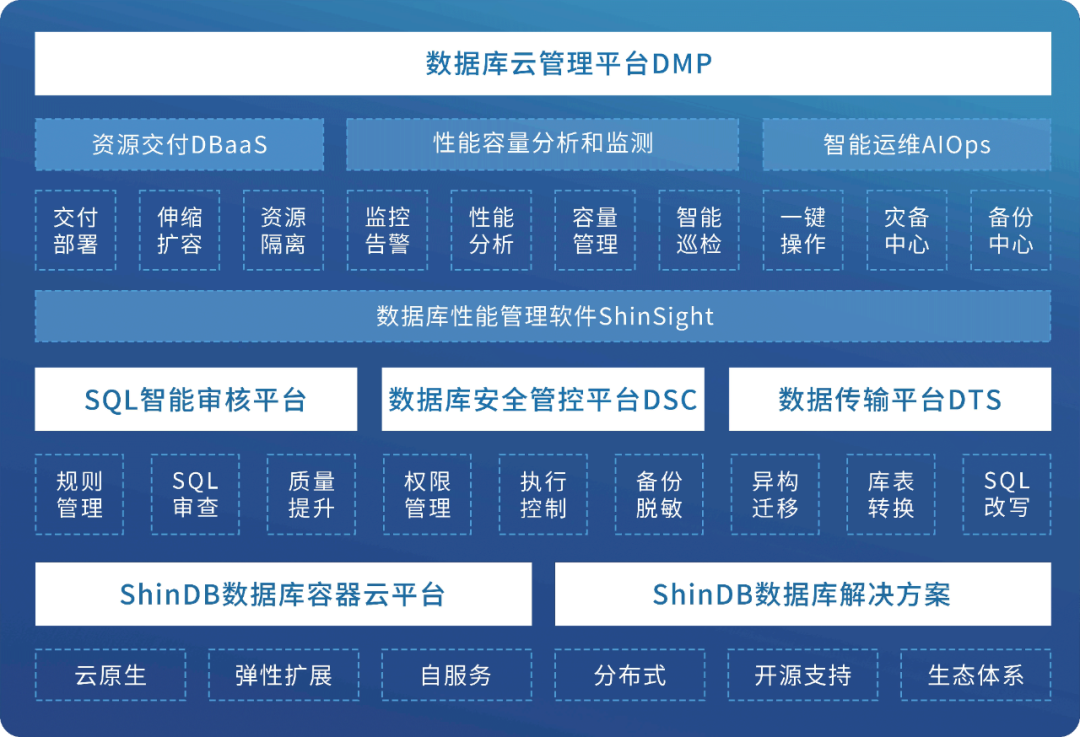 在应用运维管理和研发效能层面,新数为银行业应用系统开发建设提供统一的开发、部署、运行以及运维的基础技术支撑平台;在信创化改造方向,率先支持全栈信创软硬件生态体系,能够对主流IaaS包括国产化芯片等基础设施做到统一纳管和产品互认;在高阶安全保障方面,新数数据库云平台能够提供高可用技术风险保障解决方案,涵盖巡检、监控、审核、权限管理、容灾应急的产品能力和服务;在云化体系建设过程中,平台作为PaaS层管理管控多元数据库的服务化能力体现,正成为企业整体数据库云建设的基石和门户。