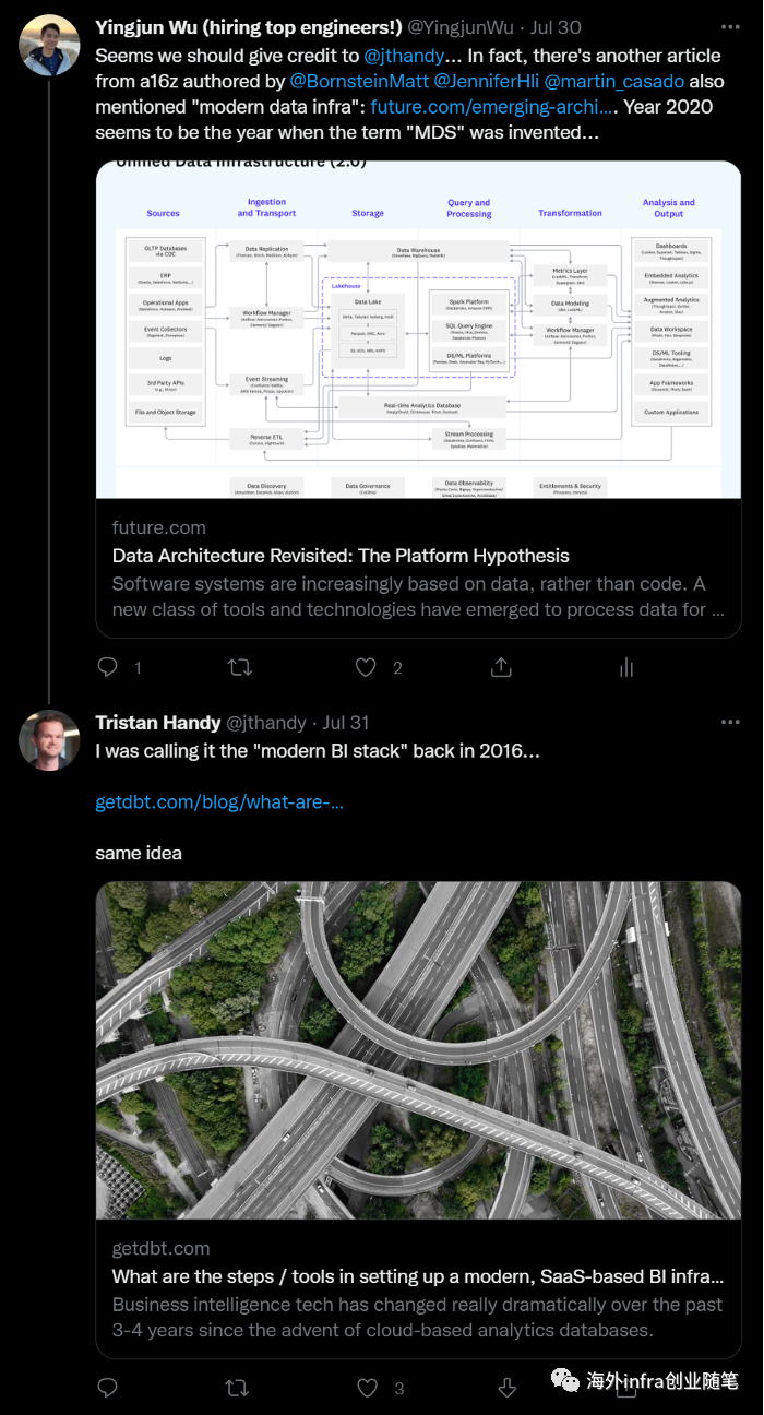 实际上,经过更加深入的搜索,我们会发现,另一家创业公司Fivetran的CEO George Fraser在2019年的一个演讲中就提到了这个概念:https://www.fivetran.com/blog/competitive-analytics-requires-modern-architecture。而在Twitter上,dbt CEO又提到,他自己早在2016年就提出过类似的现代BI栈的概念。