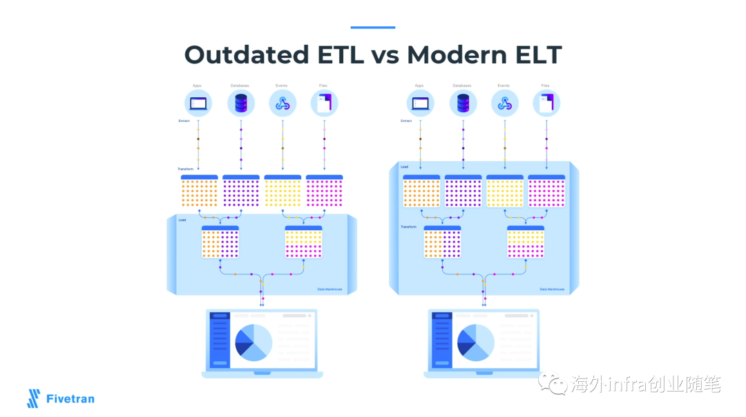 上面提到,现代数据栈的倡导者包括了dbt,Fivetran,a16z等一众数据软件公司与投资机构。他们是什么关系?实际上,a16z投资了dbt与Fivetran,而dbt与Fivetran是紧密合作关系,而两家都想改变的东西就是数据的导入与使用方式:他们都希望企业导入与使用数据的方式,从传统的Extract,Transform,Load(ETL)变成Extract,Load,Transform(ELT)所谓ETL,就是从数据源到数据仓库中,需要经过数据抽取,数据转换,数据导入三个步骤。而ELT说的是,从数据源到数据仓库,只需要经过数据抽取与数据导入,而数据转换直接在数据仓库中进行。用更通俗的语言来表述,ETL所倡导的方式,就是将数据源中的数据经过一定加工再插入到数据仓库中,而ELT所倡导的方式,就是数据直接从数据源插入到数据仓库,让数据仓库来处理数据加工的步骤。上面所说的Fivetran公司,就是在做E跟L这两步,而dbt就是在做T。
