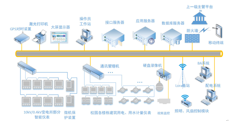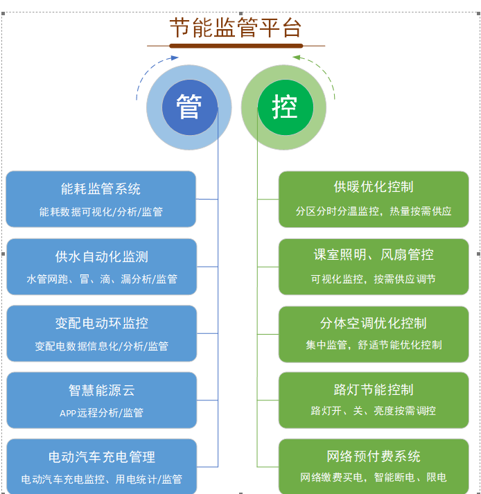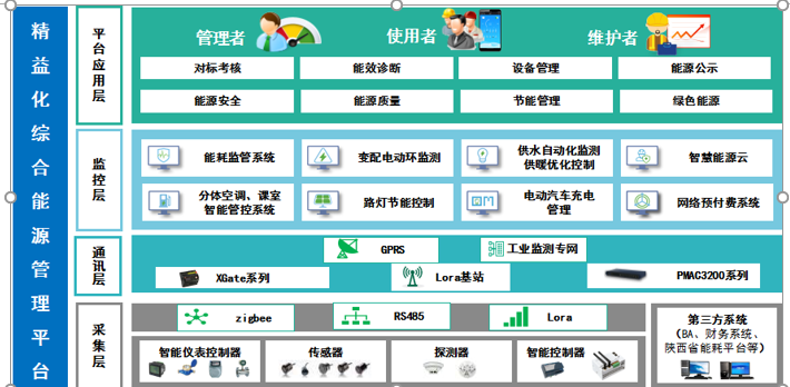 xx学校智慧校园节能监管平台,通过业务集成连接能耗监管系统、供水自动化监测、变配电动环监控、智慧能源云、电动汽车充电管理、供暖优化控制、课室照明及风扇管控、分体空调优化控制、路灯节能控制、网络预付费系统等相关单元、子系统,通过多协议网关实现不同的数据接口之间的统一,并通过在线整合,在数据库中建立通用数据模型,到达节能监管平台核心分析层,通过核心分析层进行管理、分析、优化,实现学校能源监控一体化管理。