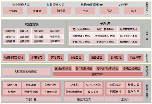 应用层主要包含各子系统及功能模块,涵盖用电管理、用水管理、燃气消耗管理、冷热量消耗管理、计费、计量器具管理、能耗数据统计分析等各个环节。