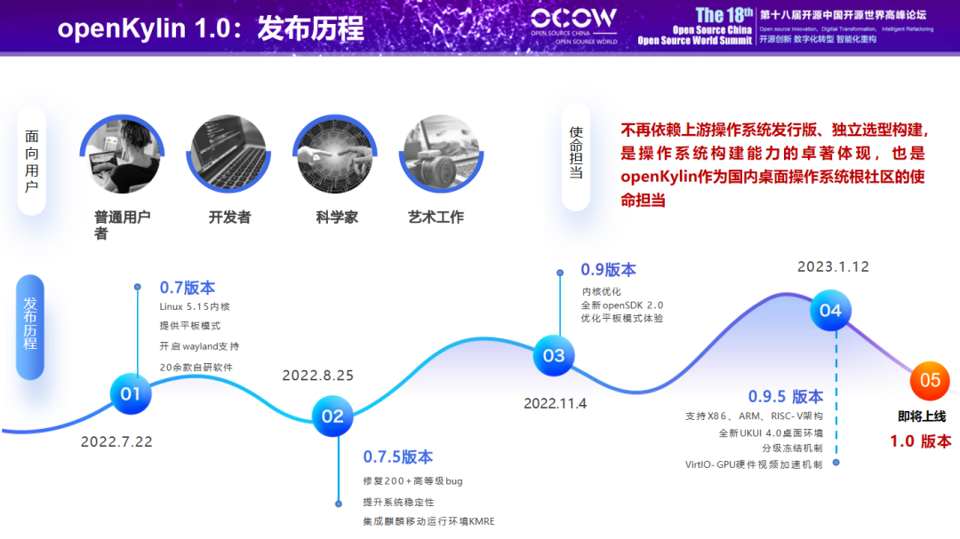 openKylin社区秘书长余杰在大会发言中透露,openKylin 1.0版本将在7月正式发布。openKylin社区是由麒麟软件主导发起的中国桌面操作系统根社区,旨在以“共创”为核心,推动操作系统技术创新和生态共建,打造中国自己的“根力量”。