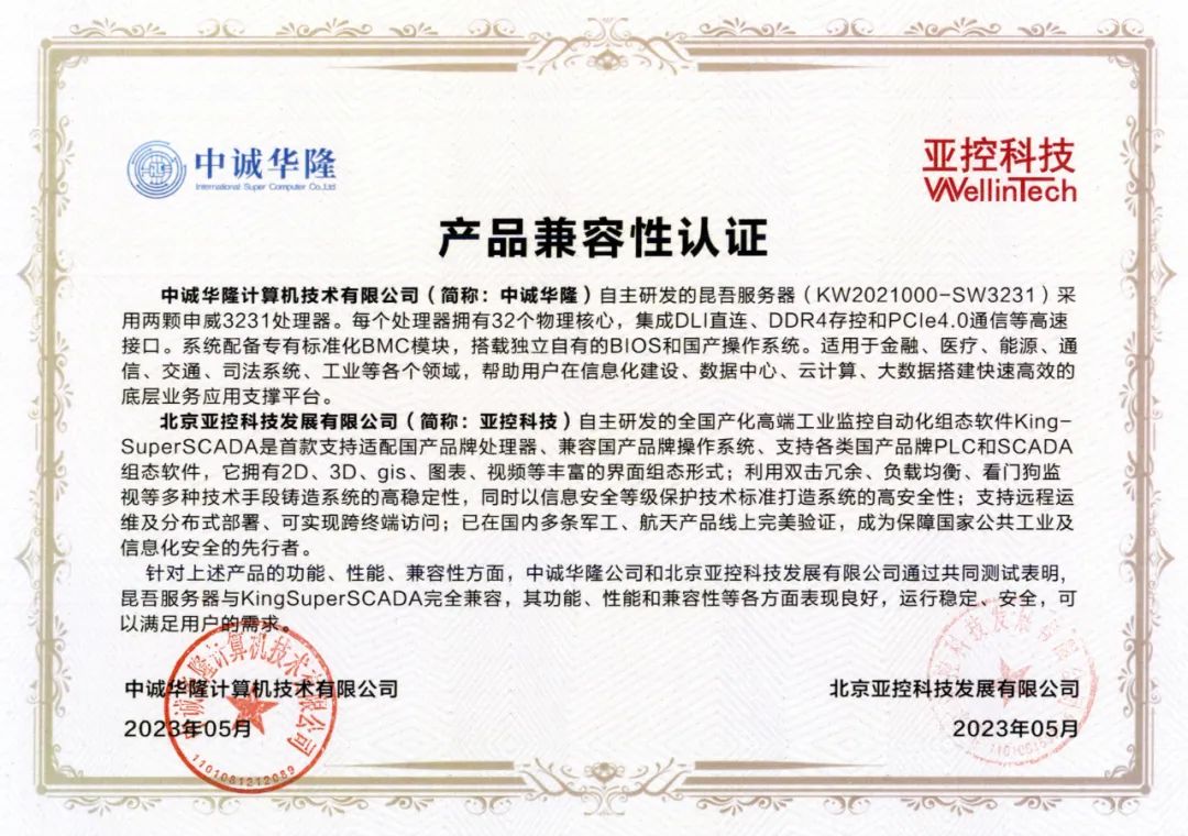 经过双方一系列全面严谨的认证测试后,双方认定亚控科技高端工业自动化监控组态软件平台KingSuperSCADA与昆吾服务器(KW2021000-SW3231)完成兼容性测试,能够达到通用兼容性要求及性能、可靠性要求,满足用户的关键性应用需求。