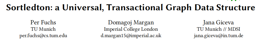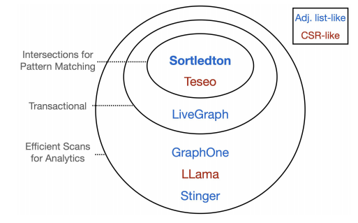 Sortledton设计了相关的实验,将同一个顶点的邻域存储在块大小超过256的链状块结构即可达到与存储在连续内存空间相近的效率。同时,Teseo中针对扫描所有顶点邻域的优化并不是必要的。最后,Sortledton总结了包括LiveGraph和Teseo在内的多个动态图分析结构,认为动态图结合事务系统需要提供三类操作:支持并发的事务操作,用于图分析的扫描操作和用于图模式匹配的快速交集(要求数据结构有序)操作。