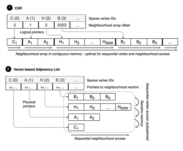 CSR通过将所有顶点的所有邻域共同存储连续的内存位置,形成一个紧凑的结构,支持快速的读取,但需要承担高额的修改代价。邻接表的各个顶点邻域分别存储,读取上由于邻域不存储在一起需要若干次指针查找会逊色于CSR结构。