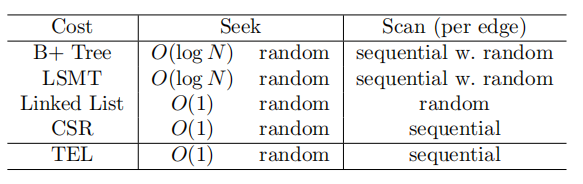 图分析的基本操作是大量的邻接表扫描,包含一次查找顶点邻域的seek和一次扫描邻域的scan两种操作。目前的主流图存储结构中,通常分为以neo4j为代表的链表形式、为了适应磁盘交换数据而设计的LSM-Tree(Log Structured Merge Tree)和B+Tree及上文描述过的CSR形式。这些结构在两类操作(seek和scan)上的效率各不相同。CSR以更新代价为代价达到最好的性能。
