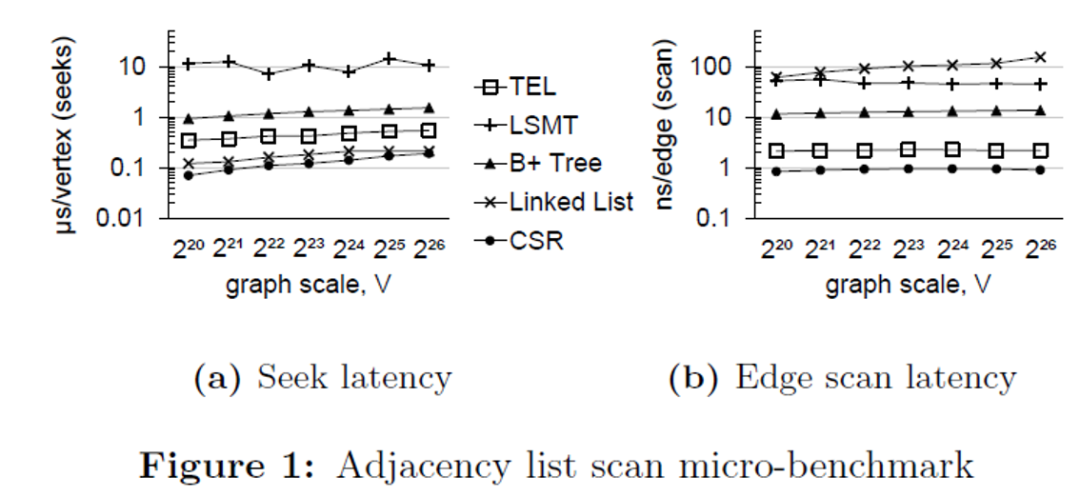 这之中,LiveGraph提出的新数据结构:事务型边日志(TEL)在连续TEL在连续内存上结合多版本,能够达到类似CSR的常数级seek并支持连续扫描邻域。下表也能够体现TEL相对于LSMT、B+Tree和链表的优势。